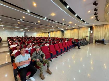 本次宣讲会特别邀请到了在国防领域有着丰富经验的渭城区委常委、区人武部上校、政治委员杨俊杰同志。他结合自身经历,从我国武装力量体系、国防的概念、国防的类型、国防的功能、国防兴衰的历史变迁及当下国际安全形势等多个维度展开阐述,为师生们进行了一次深刻的国防知识普及和爱国主义教育。