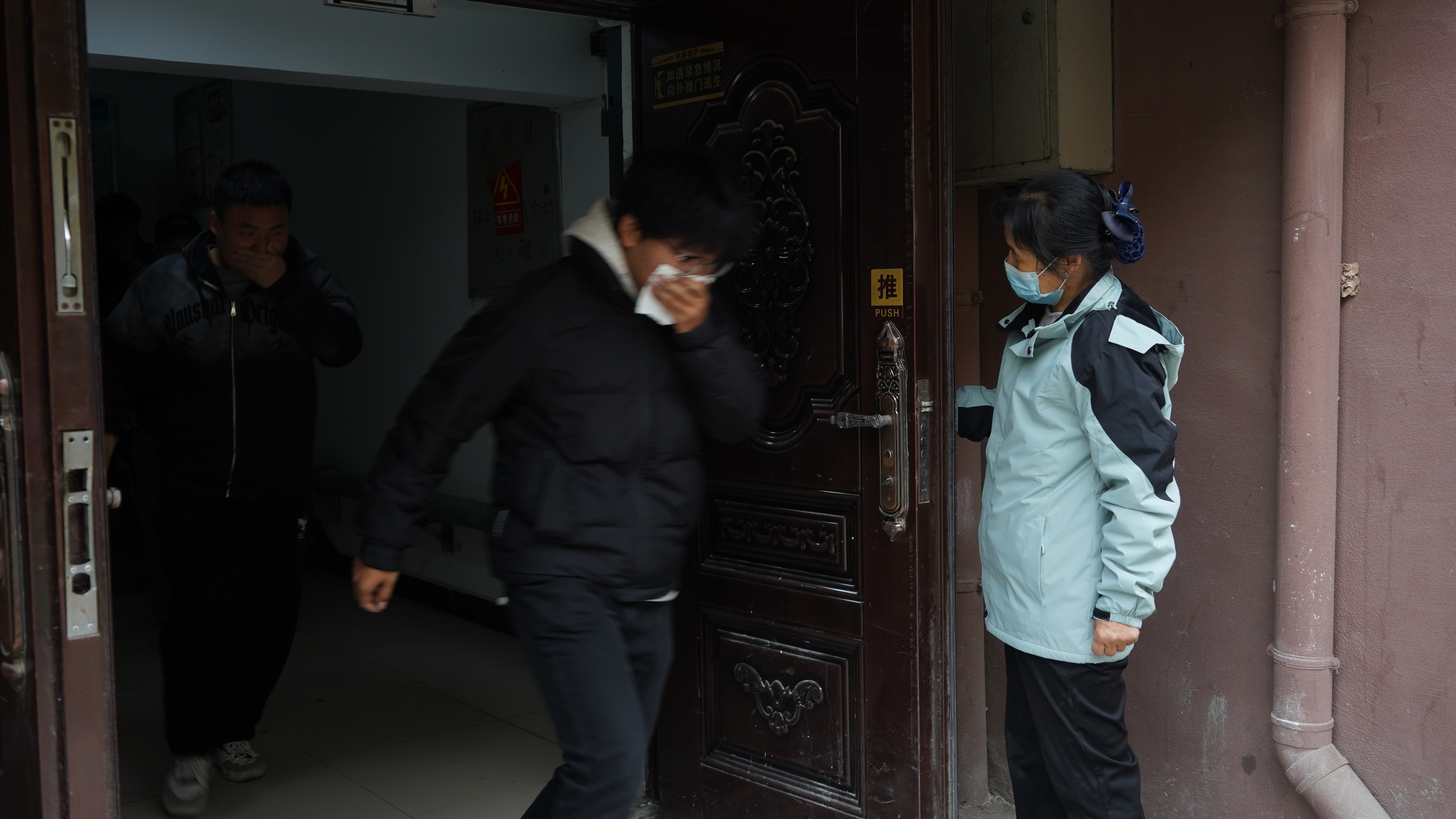 模拟发生火情后,学校立即启动应急预案,各小组按职责开展应急处置工作。学生们听到疏散警哨声后,立刻在引导员和疏导员的指引下,用湿毛巾捂口鼻、低姿弯腰,沿预定路线有序撤离。