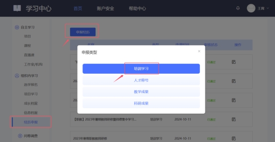(2)教师外出培训,由教师自行登录教师发展云平台完成培训经历申报(选择“经历申报”—“申报经历”—“培训学习”),并在申报页面据实填写培训信息,带“*”为必填项,且须上传培训或结业证书。