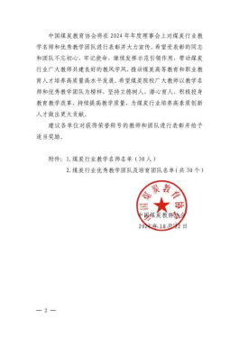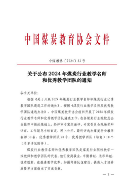 10月22日,中国煤炭教育协会下发《关于公布2024年煤炭行业教学名师和优秀教学团队的通知》(中煤教协〔2024〕23号)文件,我校周少丽副教授获评全国煤炭行业教学名师,煤矿智能开采技术教学团队获评全国煤炭行业优秀教学团队。