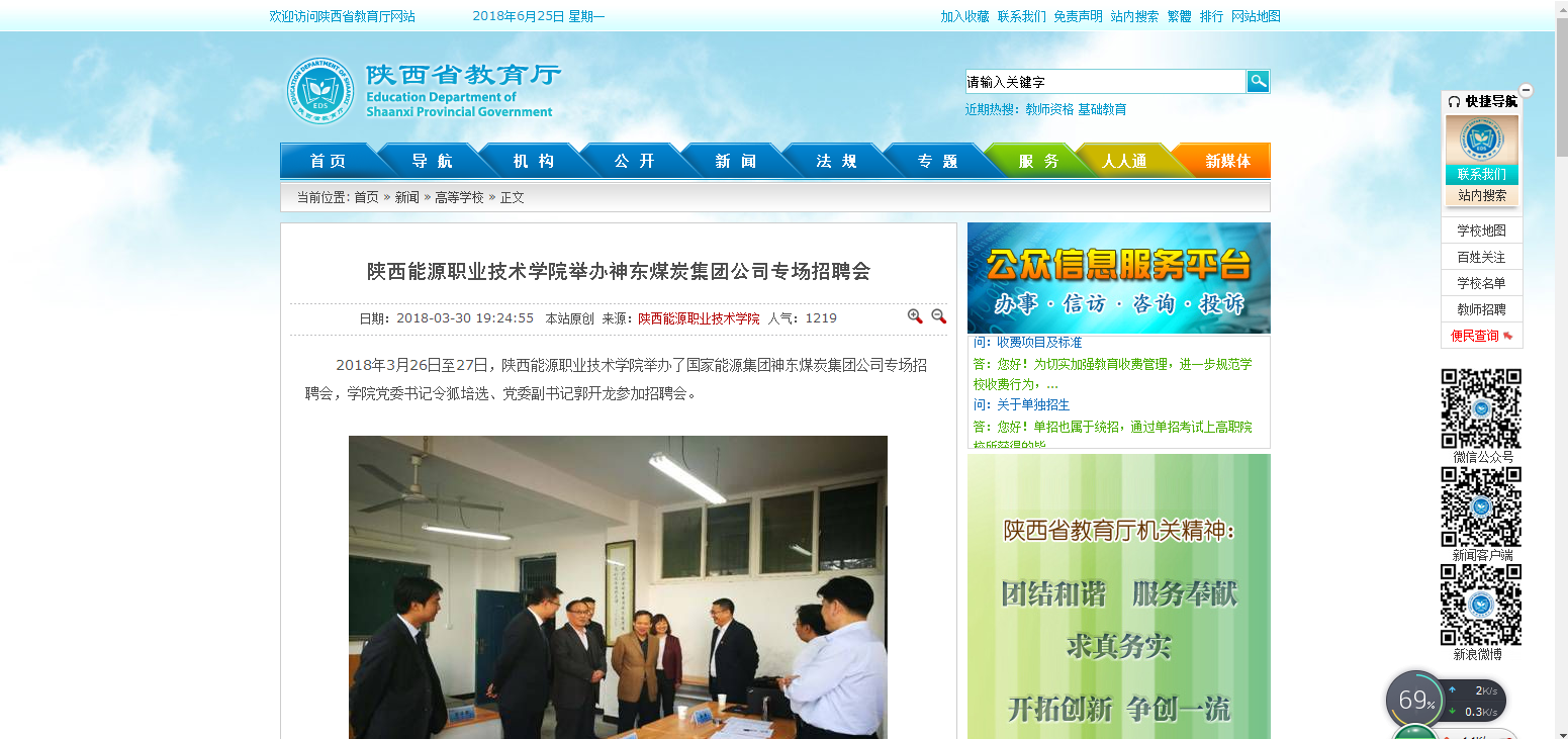 2018年3月26日至27日,陕西能源职业技术学院举办了国家能源集团神东煤炭集团公司专场招聘会,学院党委书记令狐培选、党委副书记郭开龙参加招聘会。