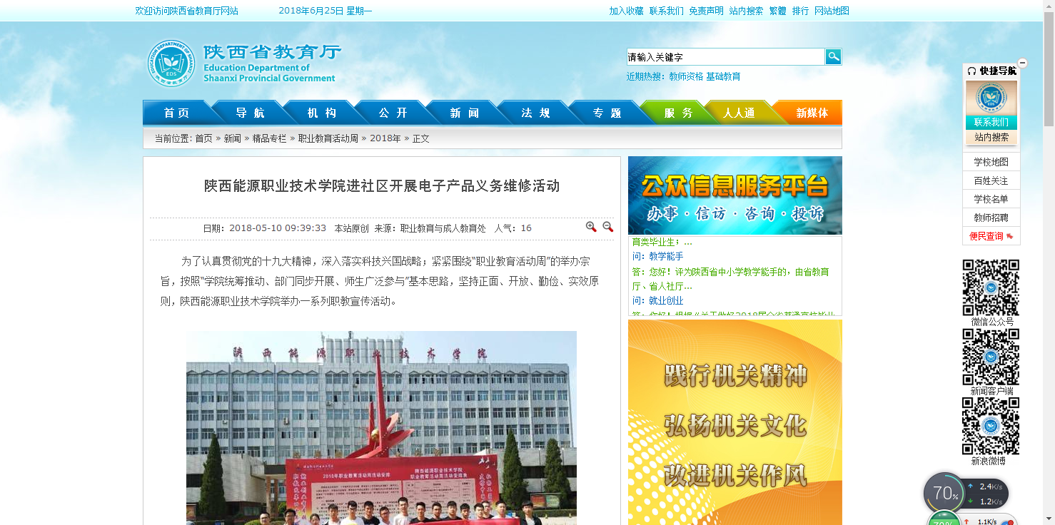 2018年5月7日,该院机电与信息工程学院组织电子制作协会15名同学,进入咸阳市文林路三丰四季阳光小区,为小区业主群众进行电子产品义务维修活动。