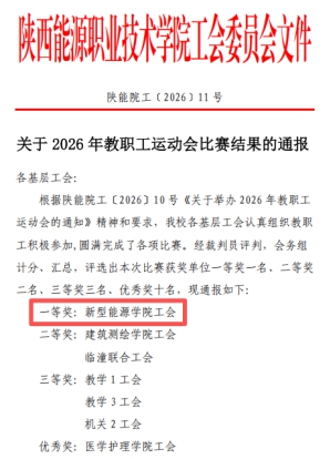 2026年4月17日下午3点,学校2026年教职工运动会在咸阳、临潼两校区田径运动场顺利举行。新型能源学院工会代表队团结协作、奋勇拼搏,在全校众多参赛队伍中脱颖而出,以总分25分的优异成绩斩获团体一等奖,展现出昂扬奋进、凝心聚力的良好精神风貌。