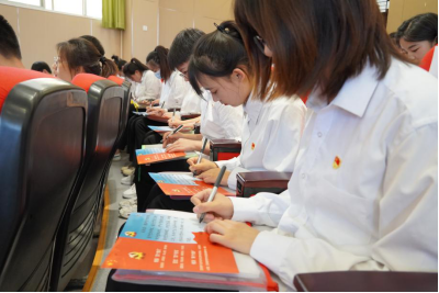 6月24日,护理学院学工党支部在105阶梯教室隆重举行2022年预备党员入党集中宣誓暨签订承诺书仪式。学院党总支书记王瑜,学工党支部书记陈小红,支部全体党员老师,50名预备党员及积极分子共同参加活动,仪式由学工党支部组织委员杜程程主持。