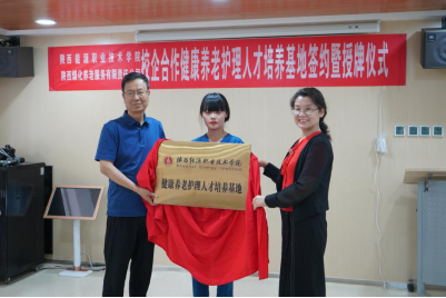 然后,由陕西能源职业技术学院副校长赵新法和陕西煤化养老服务有限责任公司执行董事兼总经理韩瑾琪作为代表,签约校企合作健康养老护理人才培养基地,并共同揭牌。
