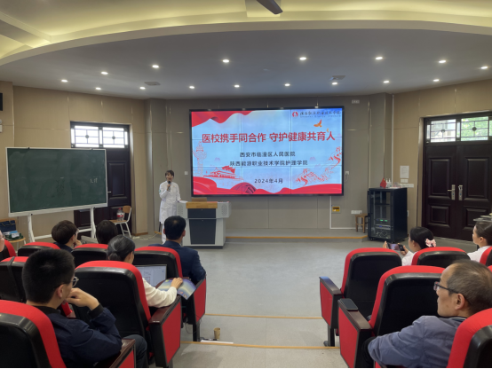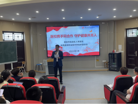 4月24日,护理学院与临潼区人民医院合作开展“医校携手同合作 守护健康共育人”5.12系列活动,活动在临潼校区105教室进行。护理学院党总支书记房朋主持,临潼区人民医院护理部主任姚飞娟、外一科护士长徐利、外二科护士长曹东海、疼痛康复科护士长何艳丽、内二科副护士长杨媛媛、内三科副护士长张珊及护理学院全体教职工、学生代表参与。