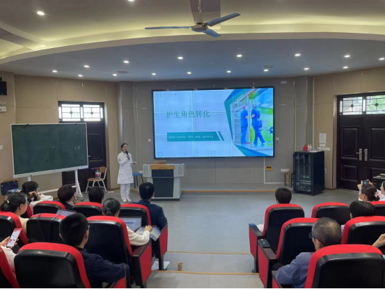 随后,徐利与曹东海分别以“护生角色转变”“护理人文关怀”为主题进行宣讲。徐利结合自身工作经历从角色的概念、护士的角色、角色的转变、角色转化的方法及职业生涯规划等五个方面生动讲述了如何才能更好地实现护士角色转变,在工作中赢得病人、同事、领导的尊重。