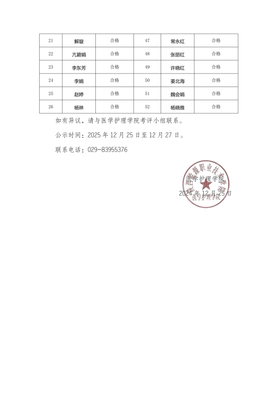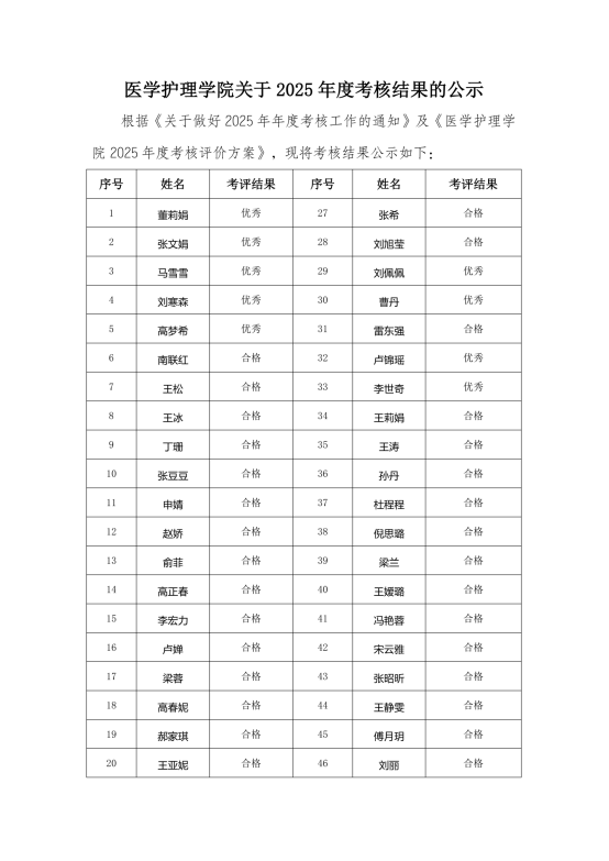 医学护理学院关于2025年度考核结果的公示