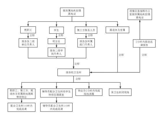 一、校内任何人接到属地疾控隔离电话,立即上报所属二级单位,教职工报告各二级单位负责人,立即报告卫生所;学生报告班主任,班主任报告各二级学院负责人,再通过学生健康联络群报告卫生所;第三方服务人员报告所属部门负责人,立即报告卫生所;离退休及家属报告卫生所;疫情应急指挥办公室接到属地疾控隔离电话报告卫生所。(卫生所联系方式:33665120;应急指挥办公室联系方式:33665028)