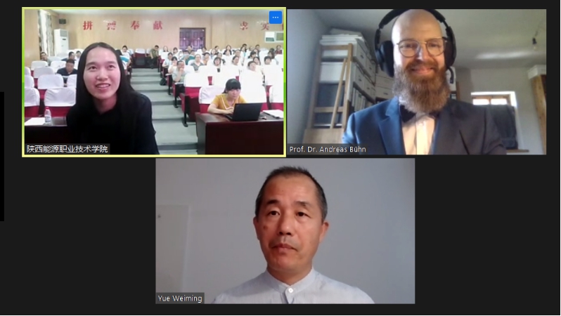 此次活动由德国BSK国际教育机构举办,通过ZOOM全球高清云视频会议软件在线进行,邀请德国萨克森双元制大学公共管理系主任安德烈亚斯·布恩教授主讲,岳维明副教授担任翻译。安德烈亚斯·布恩教授结合萨克森双元制大学办学实际,从学生入学资格、办学制度、校企合作、人才培养、课程设置及实践教学等环节向与会人员分享了双元制大学的办学理念和实践,以及“1+X证书”在德国双元制大学中的制度和实践
