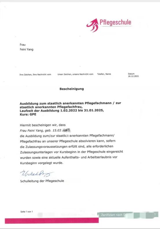 杨飞妮同学现已通过歌德学院B1等级德语水平考试,并顺利获得德国双元制护理学院的录取通知书及其合作办学医院的实习协议,计划于5月29日赴德国波恩接受为期三年的德国双元制学习和实习,实习期间享受每月1300欧元的工资。