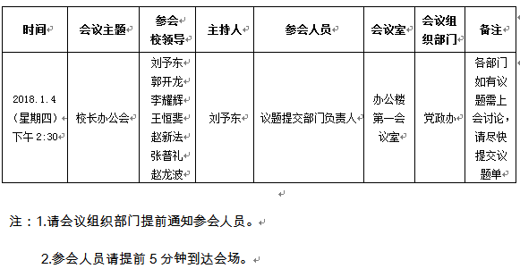 2018年1月2日至1月5日(第 19周)会议安排预通知