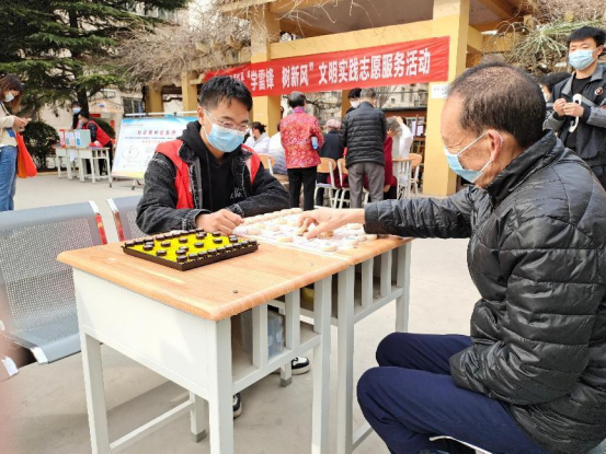 志愿者袁浩是我校象棋好爱者,陪一位老大爷连下了三盘象棋,结果三盘皆输。“大爷的棋龄比我年龄还大,我虽败犹荣。”袁浩表示,以后周末有时间就来社区陪老人下下象棋。