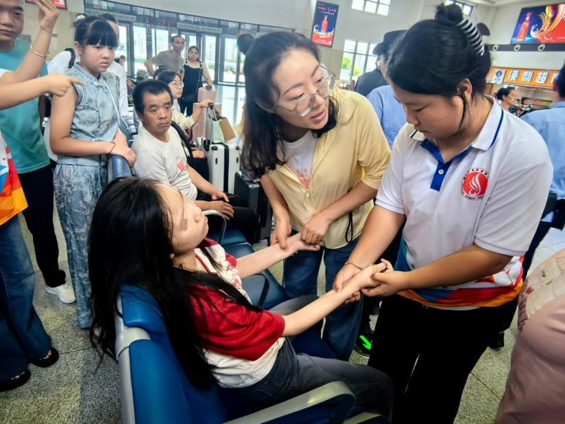 当日上午8点左右,学校“五味人生、筑梦宁强”与“党建育魂、匠心建测”实践团的师生刚刚结束在宁强的社会实践活动返校途中听见了车站的紧急通知,迅速赶到现场。到达现场后,看到一名女性晕倒在座位上,失去意识已经休克,情况十分紧急。我校俞菲老师带领实践团康复专业学生共同为患者进行抢救,经初步检查发现患者意识丧失,呼之不应,脉搏微弱,面色及口唇苍白,出冷汗。俞老师紧急按揉人中、合谷、内关,同时询问其母亲患者是否空腹,是否还有其他疾病,并嘱咐其他团员准备热糖水,经过师生不断按揉救助,患者意识逐渐恢复稳定。由于即将乘车,俞老师反复叮嘱乘务员继续观察,等待120医生,并叮嘱患者母亲关注患者情况,及时就医。