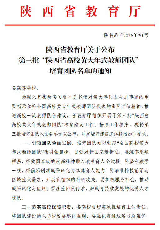 近日,陕西省教育厅印发《陕西省教育厅关于公布第三批“陕西省高校黄大年式教师团队”培育团队名单的通知》(陕教函〔2026〕20号)文件,我校丁海英教授负责的煤矿智能开采技术教师团队入选第三批“陕西省高校黄大年式教师团队”培育团队。