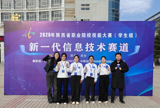 近日,由陕西省教育厅主办的2026年陕西省职业院校技能大赛(高职组)新一代信息技术赛道在陕西国防工业职业技术学院落下帷幕。信息商务学院派出由班邵雄、何雪卉指导的宋敏、王亚茹、董鑫怡、段雨帆组成的团队凭借扎实的专业功底、稳定的赛场发挥与出色的团队协作,斩获小组第二名。
