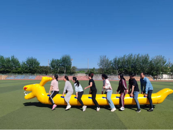 教职工运动会共设五个集体项目,兼顾趣味性与协作性。在“协力前行”项目中,队员们一字排列、步伐一致冲向终点;“旱地龙舟”赛场上,各队骑跨充气龙舟,喊着节拍奋力前行,引得场边观众阵阵喝彩;“8”字绕长绳项目考验节奏与默契,摇绳与跳绳配合流畅,如行云流水;在“定时定点投篮”项目中,老师们一展身手,精准投篮赢得掌声不断;而“能量传递”项目则需要队员们拉紧线绳轨道接力运送小球,考验耐心与团队配合。
