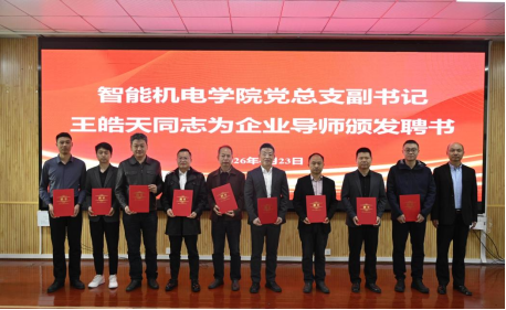 在热烈掌声中,由任向明、刘金娃、权维军、王超共同为超声诊断仪安装维修考评中心完成揭牌仪式。随后,智能机电学院党总支副书记王皓天代表学校,为企业特聘导师现场颁发了聘书。