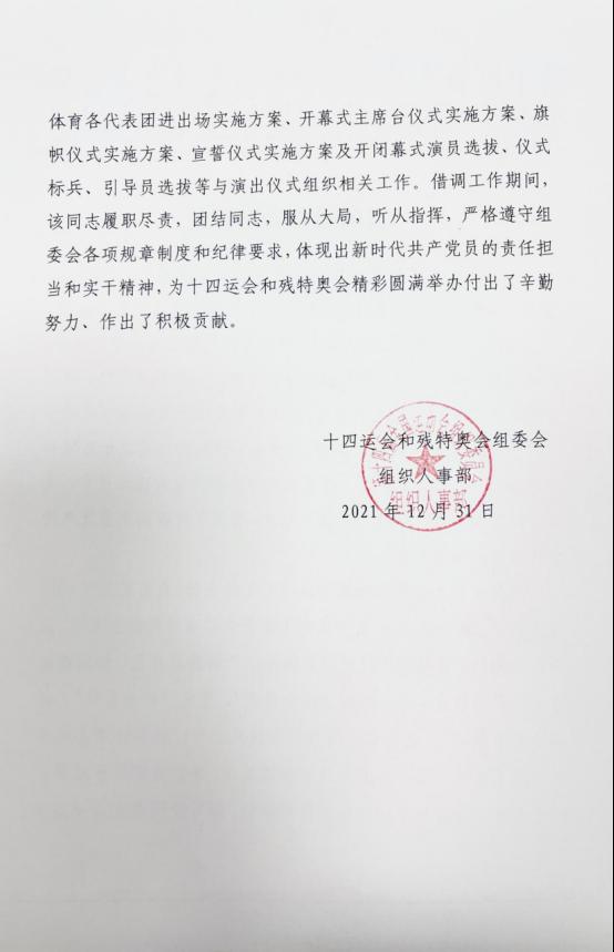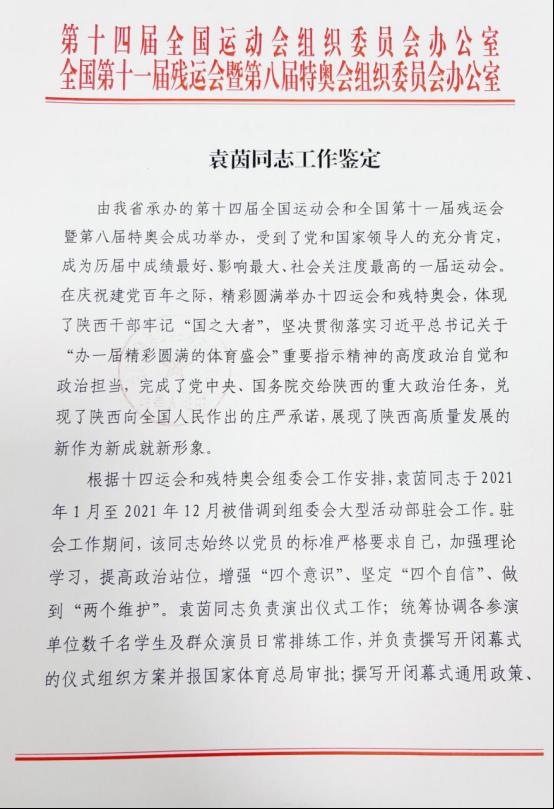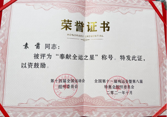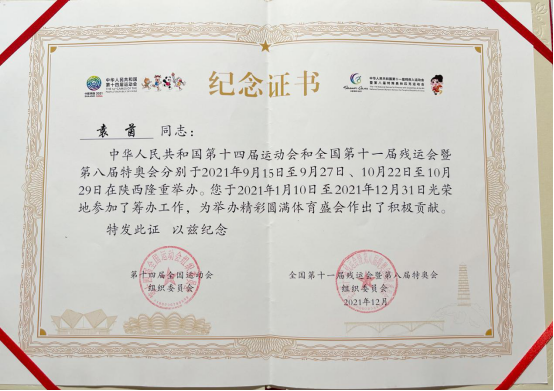 根据十四运会和残特奥会组委会工作安排,我校体育部教师袁茵于2021年1月至2021年12月参与十四运会和残特奥会大型活动部工作。借调期间,袁茵老师履职尽责、忘我工作,体现出新时代共产党员的责任与担当和实干精神,出色完成各项工作任务,得到组委会充分肯定,荣获组委会“奉献全运之星”荣誉称号。