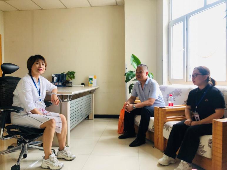 在与企业交流结束后,张栋、雷翠玲一行看望了在公司实习、就业的学生。同学们对于院领导和老师的探望和关心表示感谢和欣喜,在座谈中,一位18级刚毕业的学生表示,“感谢这三年来学校的悉心教导和培育,特别是专业老师和班主任对我的帮助和关怀,让我在校受益良多,现在走向工作岗位了,能够通过自己的努力实现人生理想,能够帮助父母分担经济忧愁,感觉自身价值得到实现,自己也一定会常怀感恩之心,帮助更多的人。”还有很多同学谈及了自己在工作中取得的成绩及遇到的问题和困难,也非常感谢企业给予的培养和帮助,表示自己一定会乘风破浪、勇往直前。
