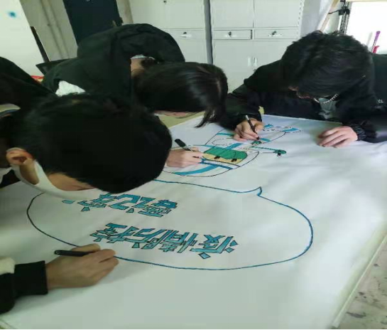 展示艺术与设计专业的志愿者们手绘防疫知识展板,放置于教学楼一楼大厅,宣传疫情防控知识。
