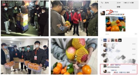 “老师给我们买水果零食啦,每个宿舍过来两名同学分装并领取本宿舍的爱心包。”1月8日晚上,同学们收到建测学院驻校党员志愿服务队发来领取水果零食的微信消息,这是同学们在学校封闭管理期间第三次收到学院的爱心物资。在学校实施学生公寓封闭管理规定后,建测学院党总支关注学生们的学习生活和心理状况,组织全体老师通过微信群及时了解学生生活所需,积极发动老师们为学生们捐款捐物补充物资。
