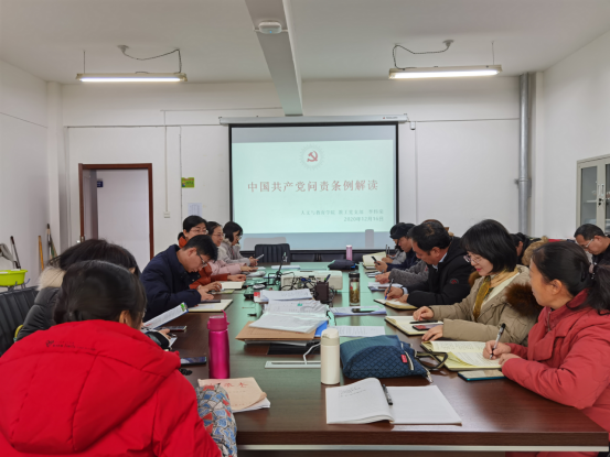2020年12月16日,在办公楼508室,人文与教育学院教工党支部书记李伟棠以“中国共产党问责条例解读”为题,为教工支部党员讲党课。