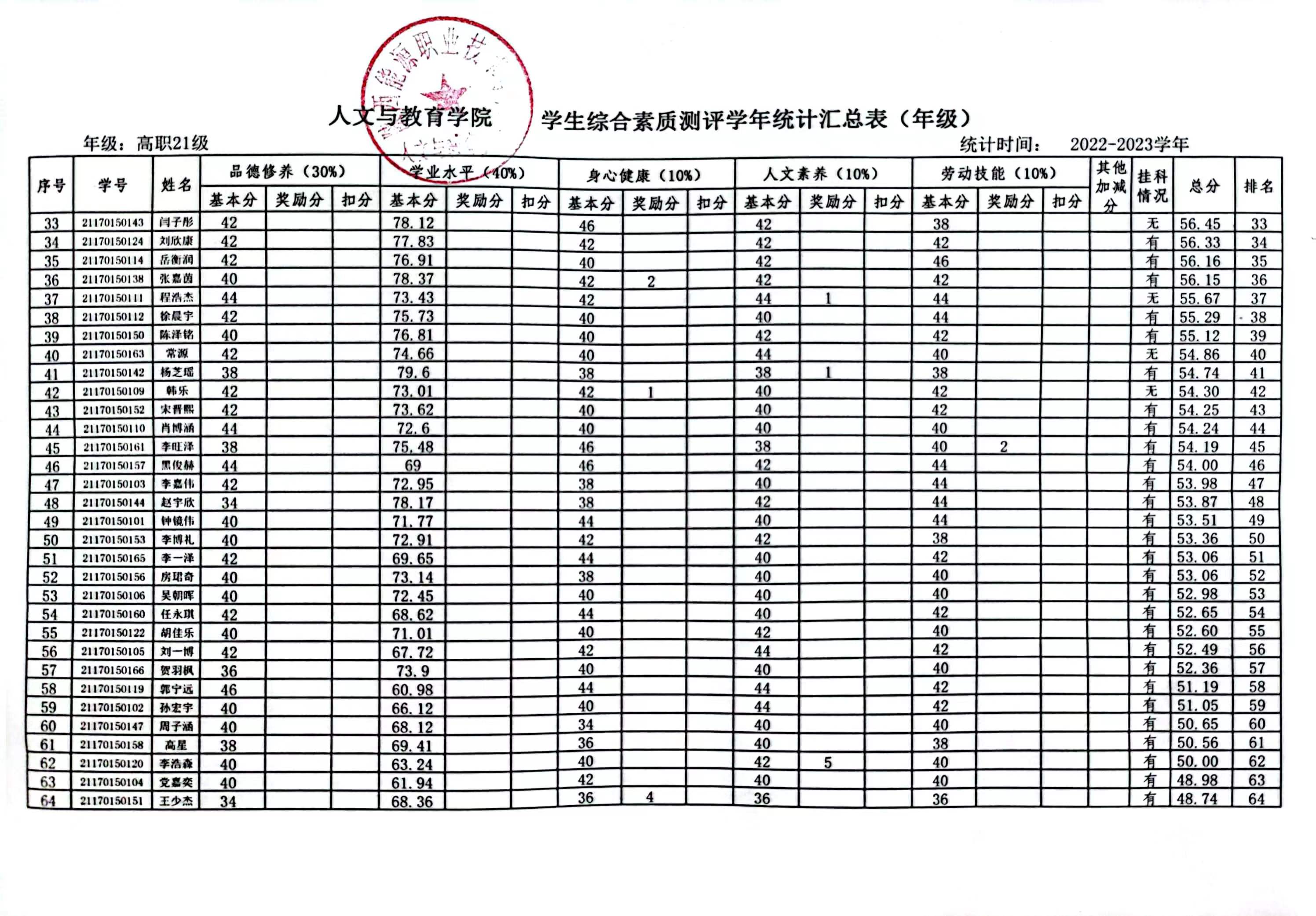 按照《陕西能源职业技术学院学生综合素质测评实施办法(修订)》(陕能院学〔2021〕36号)及学工部《关于做好2022-2023 学年学生综合素质测评总评及年度评优工作的通知》要求,人文与教育学院严格执行文件,认真总结、整理、核算学生综合素质各模块总成绩,经过材料提交、班级鉴定公示及学院审核,现将人文与教育学院学院2022-2023学年学生综合素质测评结果公示如下。