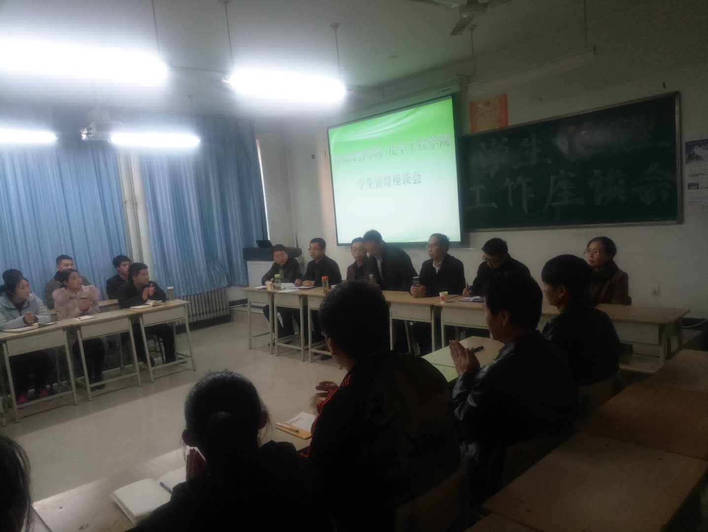 2017年12月6日下午,化学工程学院和基础课教学部在培训楼311教室联合举办学生管理工作座谈会。会议由化学工程学院学工办主任舒全安老师主持。学校党委副书记郭开龙、学工部部长丁晓军、化学工程学院党总支书记卢勇江、副院长于秋玲、基础课教学部主任郭群虎以及两个院部辅导员、班主任和部分学生干部代表参加了座谈会。