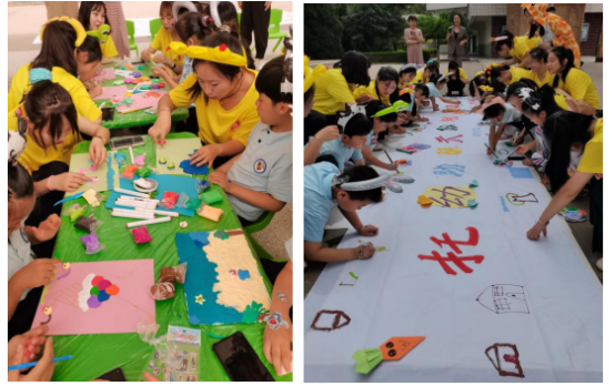 在教学楼前,同学们一对一的带着小朋友们一起做手工、在横幅上画画、签名,白色的横幅瞬间变得五彩缤纷,大家将美好的祝福都通过画笔留下了印记。