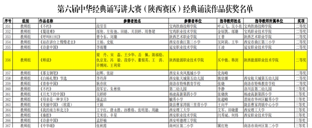 9月11日,陕西省教育厅办公室公布了第六届中华经典诵写讲大赛(陕西赛区)评选结果,由我校教师梁丹、宋磊、王少华、岳佩、陈福稳、仇京龙、冯毅、段春宇、董银英、王涛、许博闻、王利荣组成的教师组参赛团队在经典诵读大赛中荣获二等奖,是目前我校参加此项比赛获得的最好成绩。