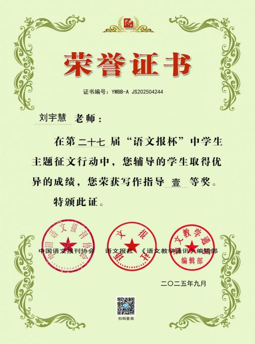 在本次赛事中,人文教育学院语文教师刘宇慧老师因指导学生成绩突出,荣获写作指导一等奖。这是继近年来多名学生在全国性语文类竞赛中取得优异成绩后,我院教师团队再一次在全国赛事中获得的重要荣誉。