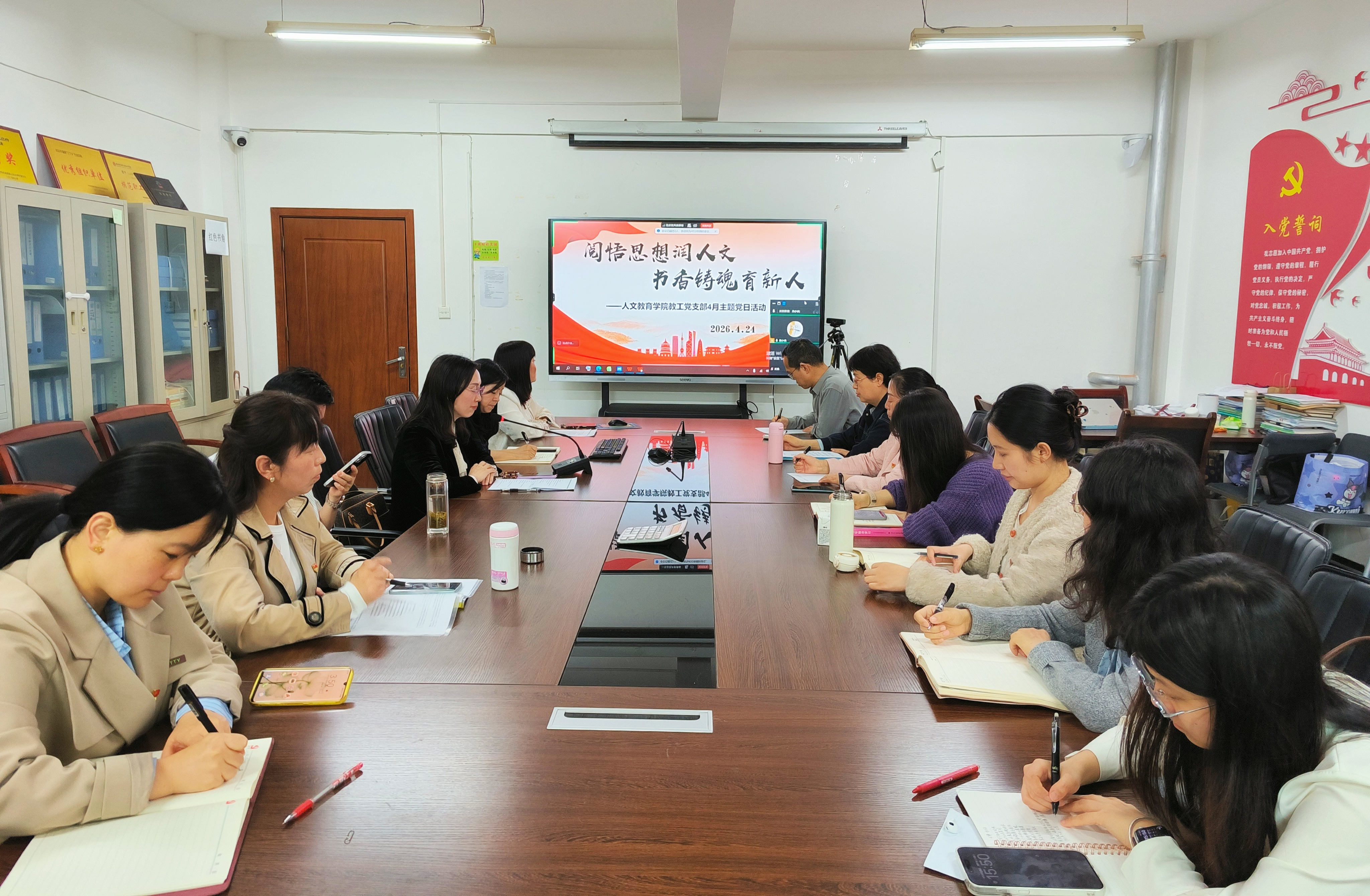 为深入学习贯彻习近平文化思想,落实全民阅读重要指示精神,充分发挥教工党员示范引领作用,推动理论学习与教书育人、课程思政深度融合,4月24日,人文教育学院教工党支部在学院508会议室开展以“阅悟思想润人文 书香铸魂育新人”为主题的党日活动。全体教工党员通过线上线下的方式,在书香浸润中筑牢思想根基,在交流探讨中凝聚育人合力。