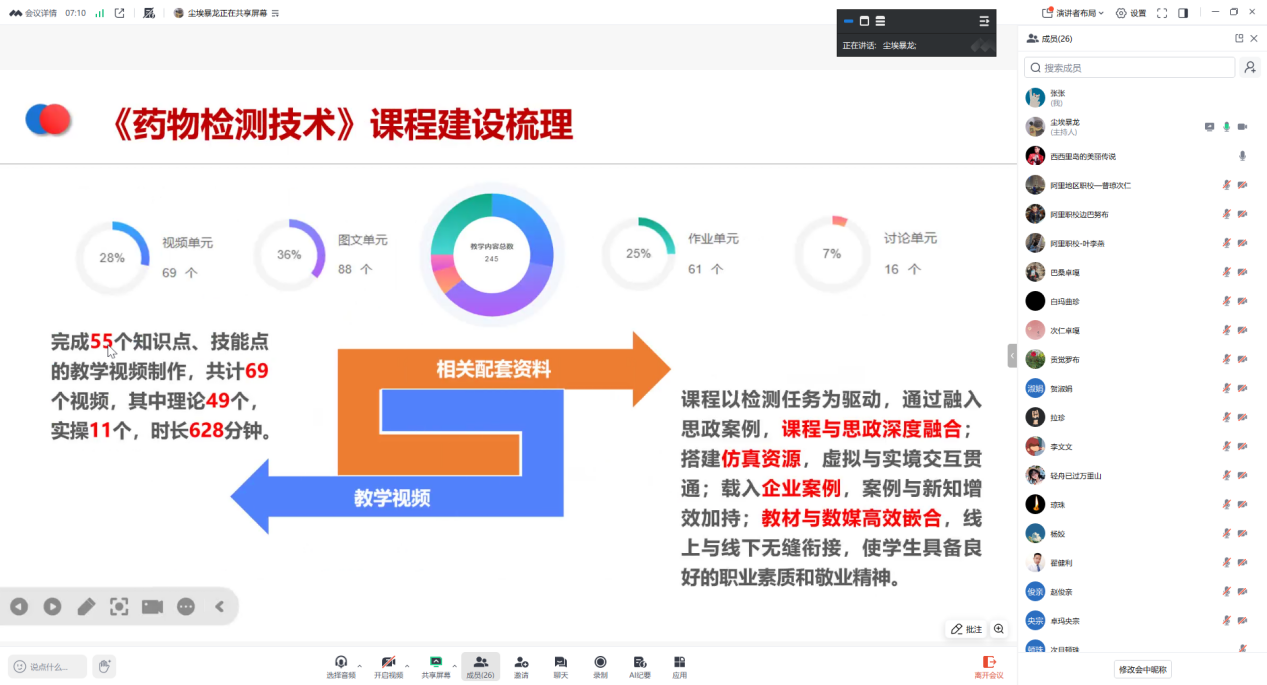 培训伊始,我校教务处副处长赵琛简要介绍了我校在课程建设与教学改革方面取得的阶段性成果。截至2025年,学校已累计建成涵盖专业课、公共基础课、思政课等类型在线开放课程128门,其中,4门国家级在线精品课程,32门省级在线精品课程,构建起系统化、高质量的数字课程资源体系,为开展跨区域教学协作与师资培训奠定了扎实基础。