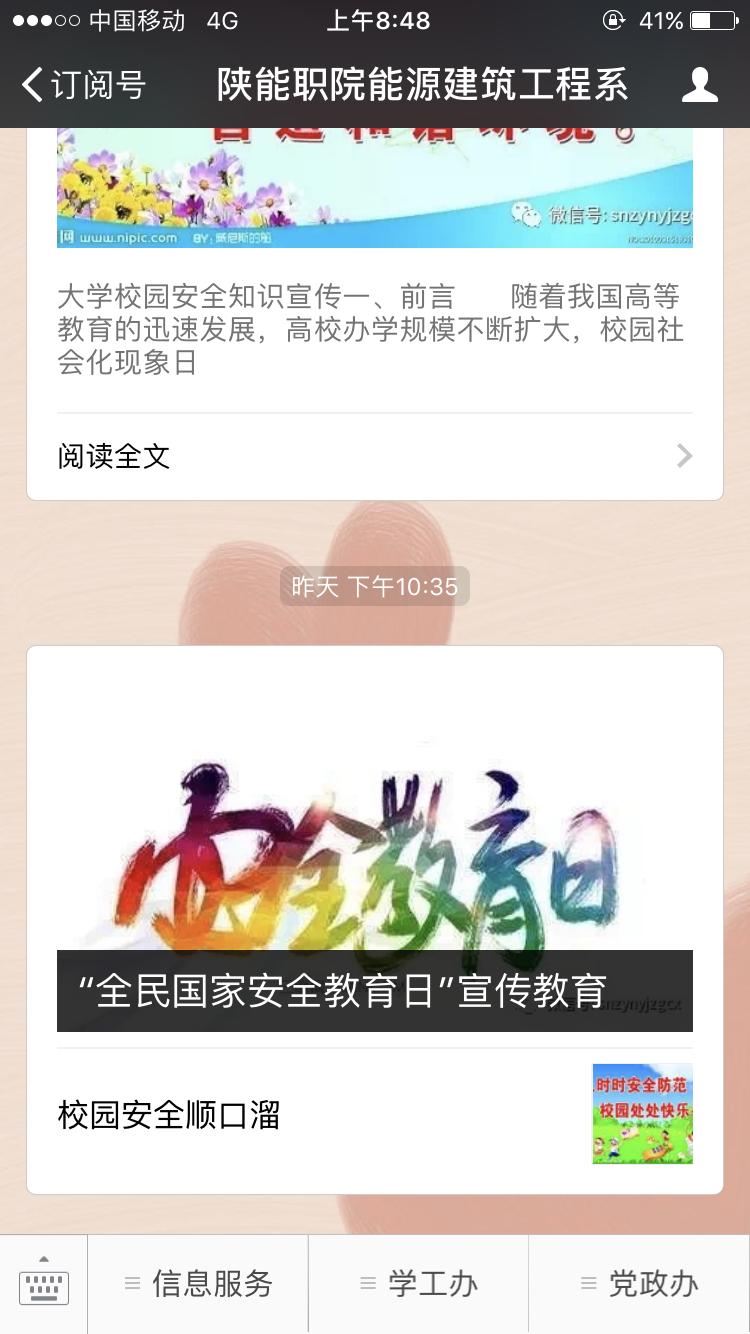 我院组织开展“国家安全教育”主题活动。活动内容丰富,各班级组织召开“国家安全教育”主题班会、观看“反奸防谍,反恐怖防渗透”主题宣传片,并在系部微信公众号在近期发布“国家安全教育”相关主题推送信息,通过学生喜闻乐见的形式,大力宣传国家安全知识增强同学们相关法律意识。