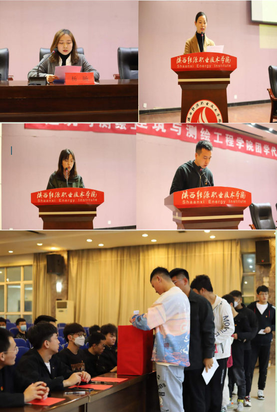 团总支书记杨旸主持选举议程,作参加共青团陕西能源职业技术学院第二次代表大会暨陕西能源职业技术学院第二次学生代表大会的代表候选人建议名单的说明。党总支组织统战委员唐凝宣读大会选举办法。选举采取无记名投票方式,参会代表经过反复思考、衡量,严肃认真地投票。经过现场唱计票、统票,公平公正公开地选出了建测学院参加校团学双代会的代表人选共计16人,学院新一届共青团委员会和学生委员会共计10人,学工党支部宣传委员季小光宣读选举结果名单。
