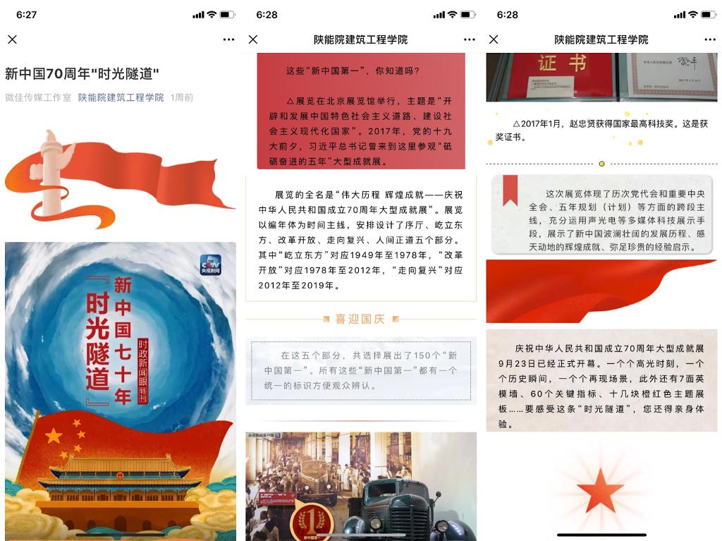 国庆前夕学院通过微信公众平台,班级QQ群、微信群,展板多渠道宣传平台推送新中国成立70周年内容;开展 “普通话诵七十华诞 规范字书爱国情怀”主题诵读活动、围绕社会主义核心价值观、我和我的祖国等内容开展“弘扬爱国主义”硬笔书写等活动,表达对祖国70华诞的祝福。