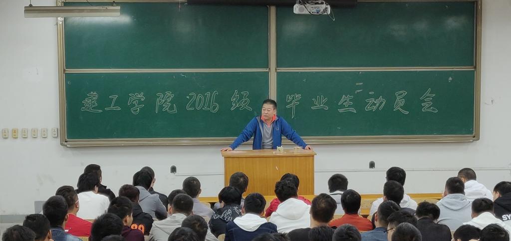 10月16日下午,建筑工程学院在综合楼502教室召开2019届毕业生就业动员会。参会人员有学院党总支书记曹蔓,学管办主任苏晓春,辅导员李贺、杨旸老师,班主任张京老师及全体2019届毕业生。