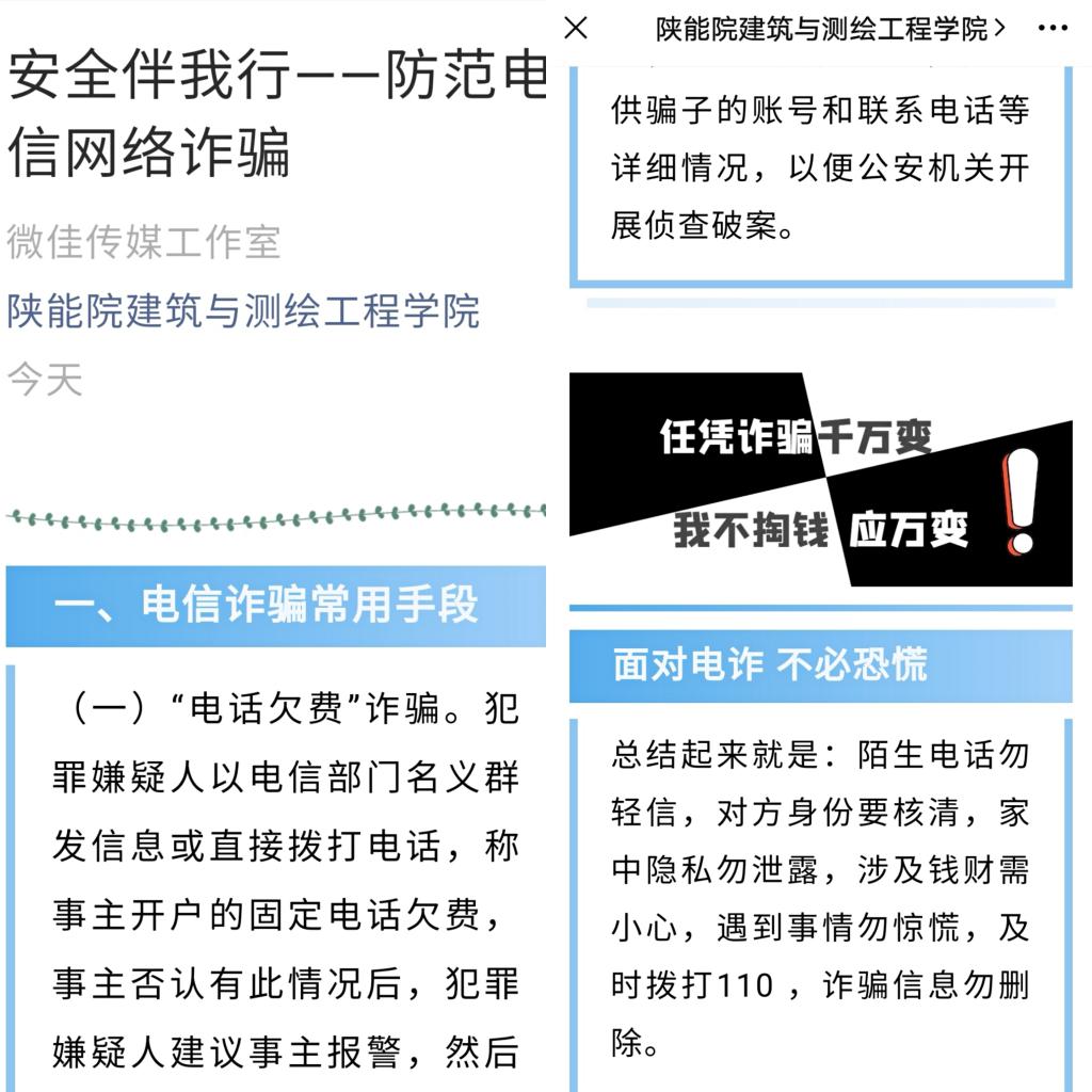 为了预防网络电信诈骗,提升学生们的金融安全防范意识,增强法律观念,切实保障广大学生的财产安全39-310日,建筑与测绘工程学院结合实际,开展预防网络电信诈骗,提高安全防范意识为主题的安全教育宣传活动。本次主题教育活动通过座谈会、线上线下主题班会、微信公众平台等形式宣传“预防网络电信诈骗”相关知识。