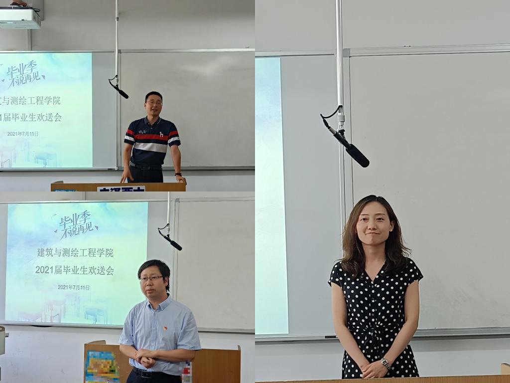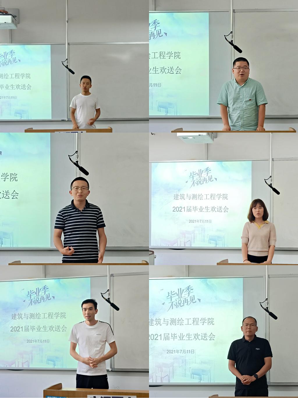 此次欢送会在教学楼109教室召开,伴随着《不说再见》音乐声,活动以投影频幕上循环播放着2021届毕业生三年来在学校学习生活的照片开场,让大家一同回忆在学校的难忘时光。首先由建测学院院长李浩讲话,对即将走出校门的毕业生送出了祝福并提出了三点希望:一是要终生学习、不断进步;二是认准一个目标要不断努力,坚持不懈,不轻言放弃;三是在人生道路上,面对困难、失败时要有一个积极的心态去面对。接着建测学院教研室主任、毕业班班主任也都纷纷送上了殷切的叮咛和真挚的祝福,主要包括以下几点:第一,建筑类行业比较看重证书,叮嘱大家在以后的工作中要多考证;第二,在以后的工作中要保持积极的心态,不要懒惰,遇到机会要主动争取;第三,刚去一个单位工作要坐的住、熬得住,不要遇到困难就轻易跳槽。随后学生代表建工1801任欢婷发言,简述了自己的大学时光,感谢老师们的无私指导与关心,并表示今后要努力工作,努力生活,不辜负学校的培养和期望。最后建测学院党总支书记总结讲话,并带领大家一同唱《明天会更好》,向毕业生送去祝福,活动过程中毕业生们纷纷用视频、照片记录下自己在学校最后的回忆。