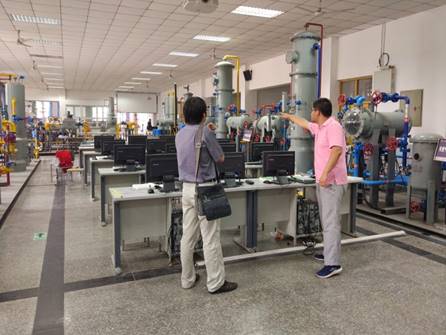 会议室交流完后,在该校老师的带领下,买中傲院长和康俊鹏老师参观了该校城市燃气专业的实训基地,包括燃气输配实训室和天然气长输管道实训室。燃气输配实训室涵盖了从城市门站(储气库)到用户终端的各个工艺流程以及常用燃气具的设备实物;天然气长输管道实训室包含了天然气从井场到门站输送过程中各种处理工艺流程。