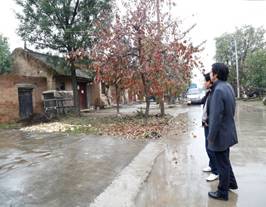 随后,在城建办杨主任、办公室刘主任和驻村干部的带领下,建工学院曹书记一行冒雨前往三王村一组、二组、四组街道及五保户住房建造工地实地考察,了解该村的道路、房屋、绿化等实际情况,并前往店张城建办收集了三王村的整体规划图纸,并就该村的规划设计情况与杨主任交换了意见,为后续的工作开展准备第一手资料。