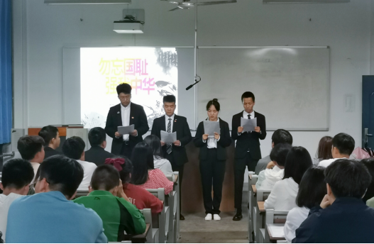 为纪念“九一八”事变爆发90周年,加强学生爱国主义教育,缅怀抗日先烈,传承抗战精神,2021年9月17日下午5:40,在我校109教室举行纪念“九一八”诵读活动。党总支书记买中傲、学工办主任杨旸,全体辅导员及我院部分同学代表参加。
