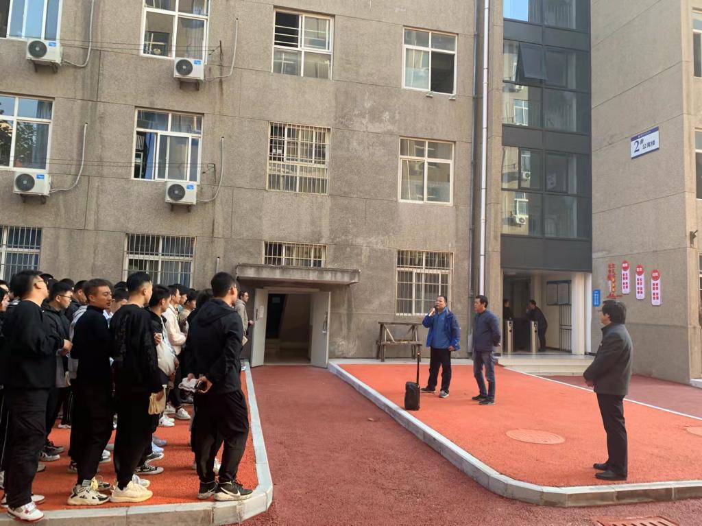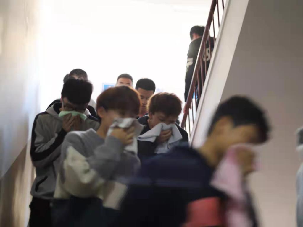 保卫处李涛防火、灭火、逃生、自救四个方面介绍了火灾发生及自救。警报响起后,同学们弯腰、捂口撤离至疏散地点。