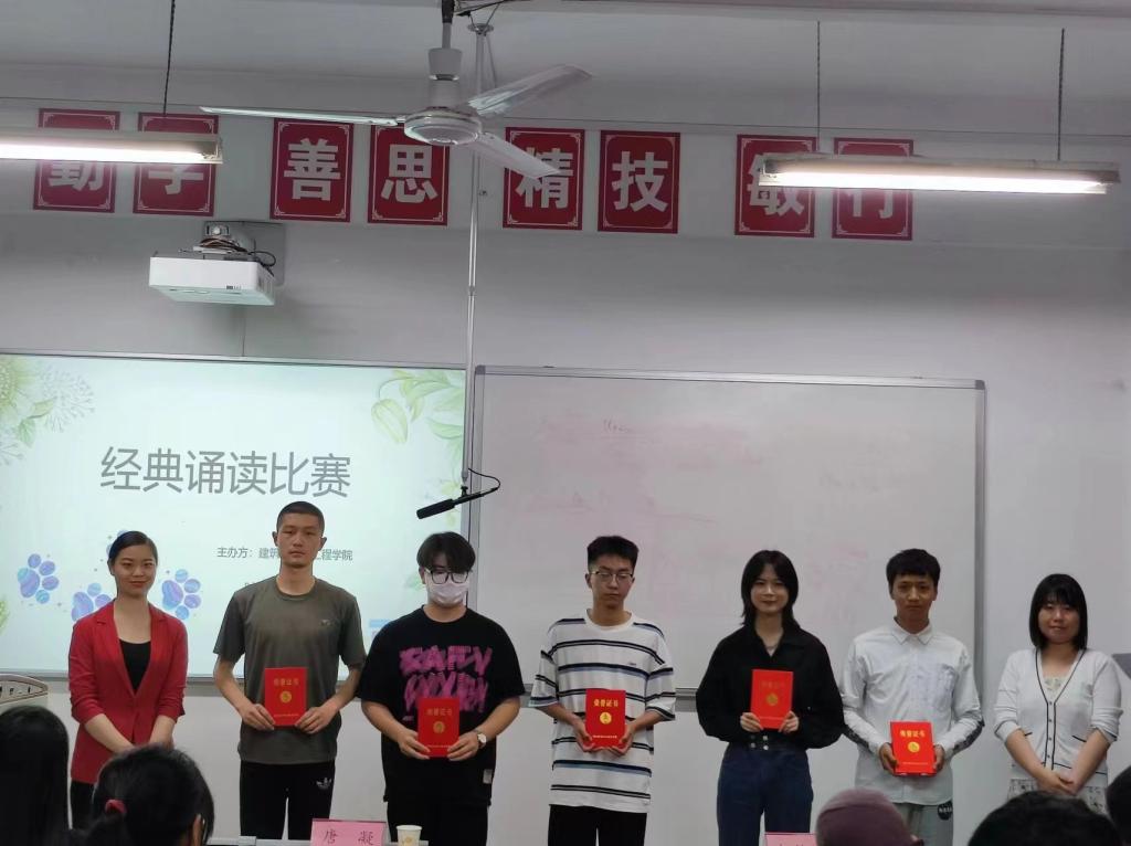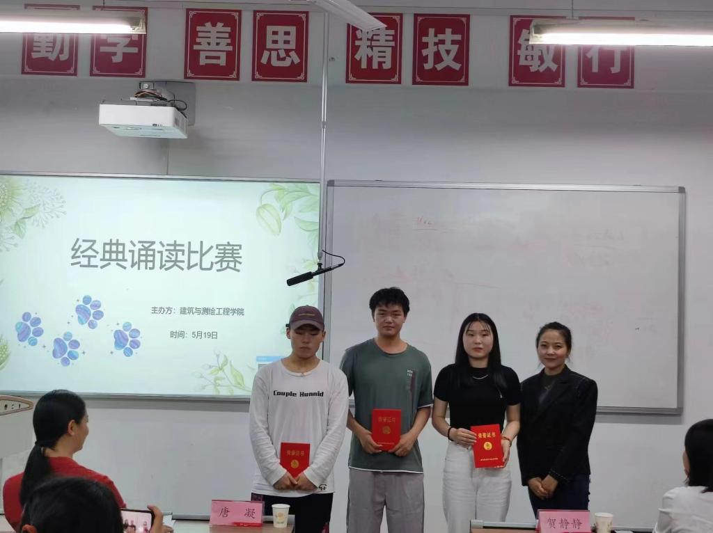 为增强广大学生的爱国情怀,提高学生文化自信,建筑与测绘工程学院于5月19日晚在教学楼116举办了国学经典朗诵比赛。此次比赛共有来自建测学院20、21级的16位参赛选手,邀请了唐凝、袁茵以及贺静静老师三位老师作为评委。此外,建测学院党总支书记买中傲、全体建测辅导员共同参加了此次活动。