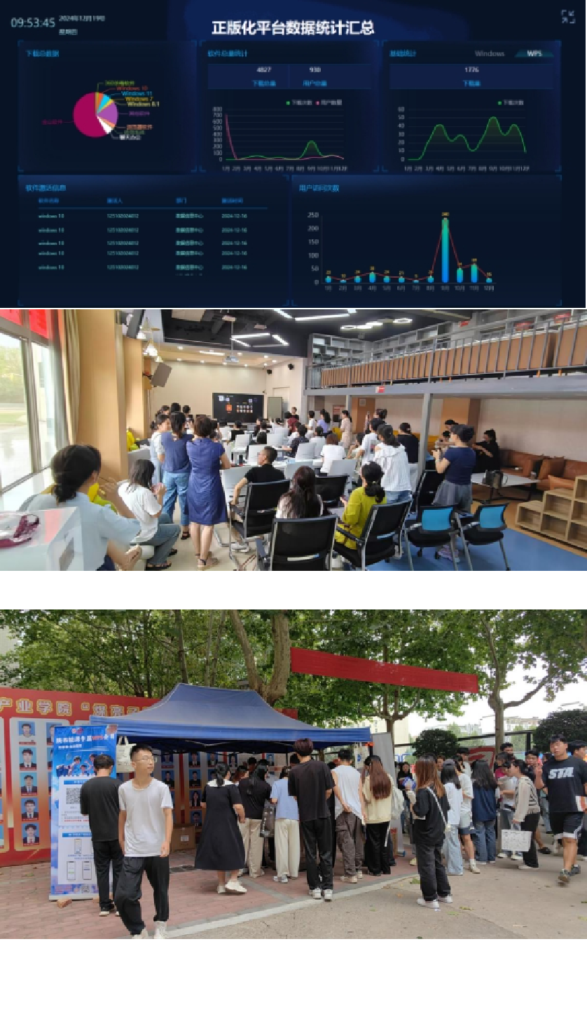 积极响应国家号召,推进软件正版化工作,2024年线上线下宣传共计25次,正版软件的激活数量逐年递增,行政电脑及机房正版操作系统及办公软件装机率达100%,国产办公软件正版化率达90%,使用率高达80%;计算机固定资产正版化覆盖率达98%;软件资产管理平台量化考核连续4年达标,软件下载量4827次,激活总量已达到2960次。WPS Office教育版激活人数3066,教师覆盖率达99%,教职工账号活跃率高达86.08%,学生活跃率达54.57%。两校区针对师生分别开展素养提升培训活动,提升师生的学习办公技能。
