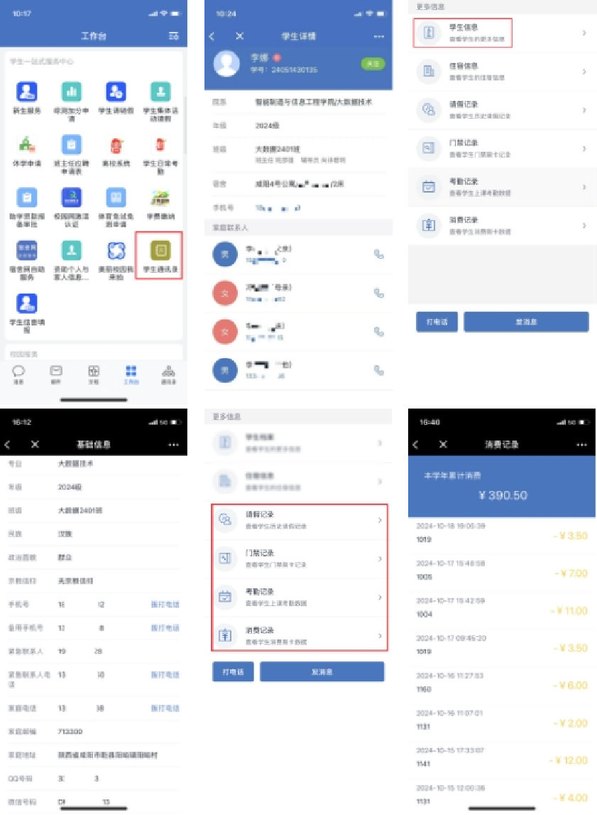 构建学生通讯录微应用,充分发掘数据中台海量数据资产价值,集成学生多维度信息,实现对学生基本信息与校园生活动态全面集成。收录了学生学籍、住宿、家人联系方式、消费记录、门禁记录、请销假记录等数据,为教职工提供一站式学生信息查询平台,提高师生沟通效率,学生管理效能。教师可通过系统速查并一键拨打家长联系电话,沟通流程简洁,促进家校互通。通过对学生日常行为数据分析,如门禁记录、消费记录等,管理人员可更深入了解学生校园生活状态,支撑精准决策,提升校园管理智能化水平,促进师生互动交流,增强教育工作者对学生的关怀能力。
