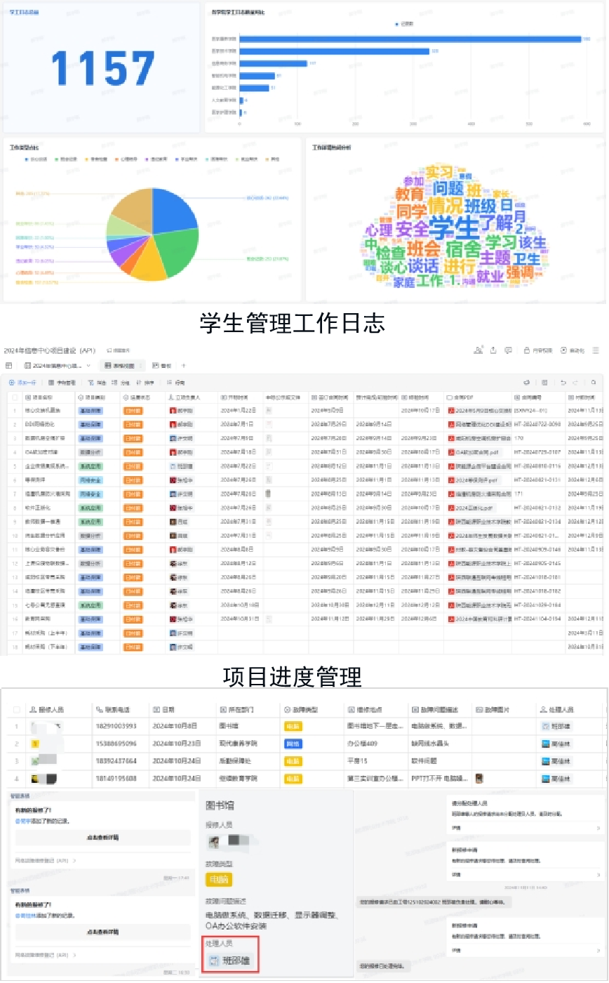 我校创新应用“能小微”平台智能表格,通过轻量化部署搭建微系统,实现多业务场景数字化升级,有效破解传统信息化系统建设周期长、适配性差等痛点。依托API智能表格构建的网络报修系统为例,系统通过扫码报修、自动派单、进度同步、闭环管理四大核心模块,实现报修处理效率提升40%,用户满意度达92%。系统在标准化平台基础上开发定制化功能,使项目实施周期缩短60%,运维成本降低35%。典型应用场景包括:学工日志系统:通过智能表格实现班主任、辅导员等日常数据采集与分析;项目进度看板:集成多部门数据,实时更新 在建项目状态,异常情况自动触发三级提醒;预算执行监控:搭建可视化数据看板,实现 预算科目执行进度穿透式管理;招生宣传管理:构建多渠道数据监测平台,精准追踪 宣传活动转化效果。目前已形成“需求快速响应-系统敏捷开发-数据实时共享”的数字化建设新模式,累计上线微系统15个,覆盖教学管理、后勤服务、校园安全等8大领域,日均处理数据交互3.2万次,为建设智慧校园提供轻量化解决方案。