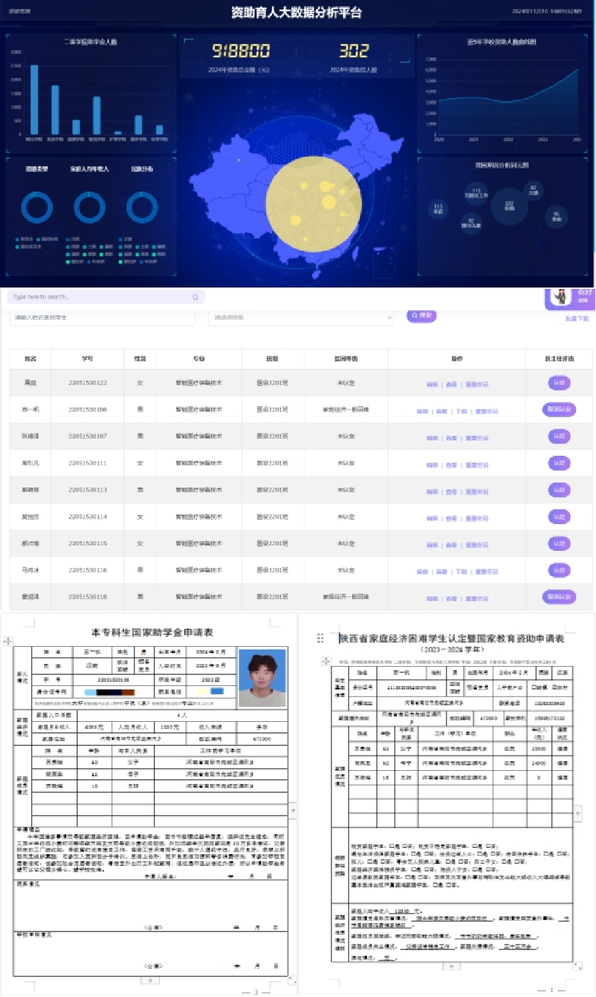 针对我校资助工作中存在的线下纸质表格重复填写、频繁修改、申请流程繁琐的问题。我校通过科研引用,研发紧随模式,致力于研发资助管理系统,通过信息化手段优化业务流程,提升工作效率,改善师生体验。资助系统实现了资助相关表格严格按照要求格式自动化生成,改善人工重复做表低效状况。目前,全校8个二级学院已应用该系统进行资助工作管理,工作效率提升60%,减轻了工作人员负担,为学生提供更透明、高效资助服务,赢得了广泛赞誉。
