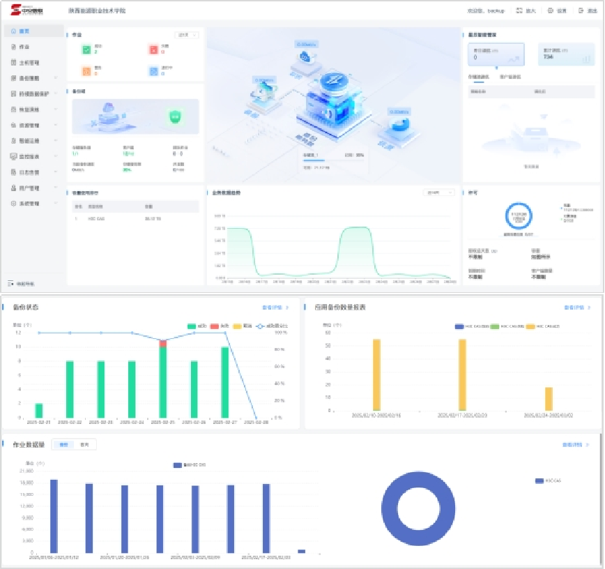 部署核心业务容灾备份系统,确保信息化建设过程中的数据安全。120TB的存储容量实现了对超融合平台上近200台虚拟机数据的100%自动化备份。采用先进的备份策略和技术手段,结合增量备份和全量备份的方式,并定期进行数据恢复演练,确保备份系统的稳定性和有效性。业务系统涉及招生系统、“一网通办”、教务系统、人事管理系统、教师一表通系统、图书馆档案管理系统等业务,保障意外删除、硬件故障、网络攻击等极端情况,能够迅速响应并快速恢复备份数据,实现数据零丢失。对于国资、财务、数据中台、OA等关键业务系统,实现实时备份,确保学院的管理和教学业务不受影响,持续稳定运行,提升了数据保护的效率与准确性。